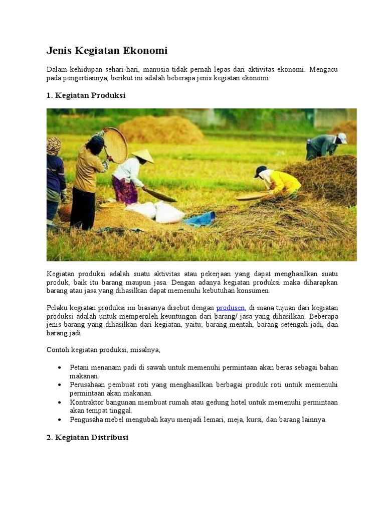 Contoh lainnya yaitu tidur atau istirahat yang termasuk aktivitas penting. Keberagaman ekonomi adalah kondisi di mana terdapat banyak jenis kegiatan ekonomi dari para pelaku ekonomi di dalam masyarakat. Ada yang bekerja sebagai petani, peternak, guru, dokter, suster. Kegiatan ekonomi meliputi berbagai jenis pekerjaan. Pelaku kegiatan produksi ini biasanya disebut dengan produsen dimana tujuan dari kegiatan produksi adalah untuk memperoleh keuntungan dari barang/ jasa yang dihasilkan. Nah, itu berarti orang tuamu melakukan usaha di bidang perdagangan. Aktivitas tersebut mencakup kebutuhan lahir maupun batin, secara khusus yang bertujuan untuk mencapai kesejahteraan, kemakmuran, dan kepuasan. Didalam suatu kegiatan ekonomi yang dikerjakan, dapat dibagi menjadi beberapa jenis kegiatan yaitu, adalah sebagai berikut : Pelaku, tujuan, jenis dan contoh. Kegiatan ekonomi dan jenis kegiatannya. Kegiatan distribusi dapat didefinisikan sebagai sebuah aktivitas menyalurkan barang atau jasa dari produsen kepada konsumen. Pertanian merupakan kegiatan produksi yang menggunakan tanah sebagai faktor utama. Hasilnya tersebut adalah bahan makanan.
