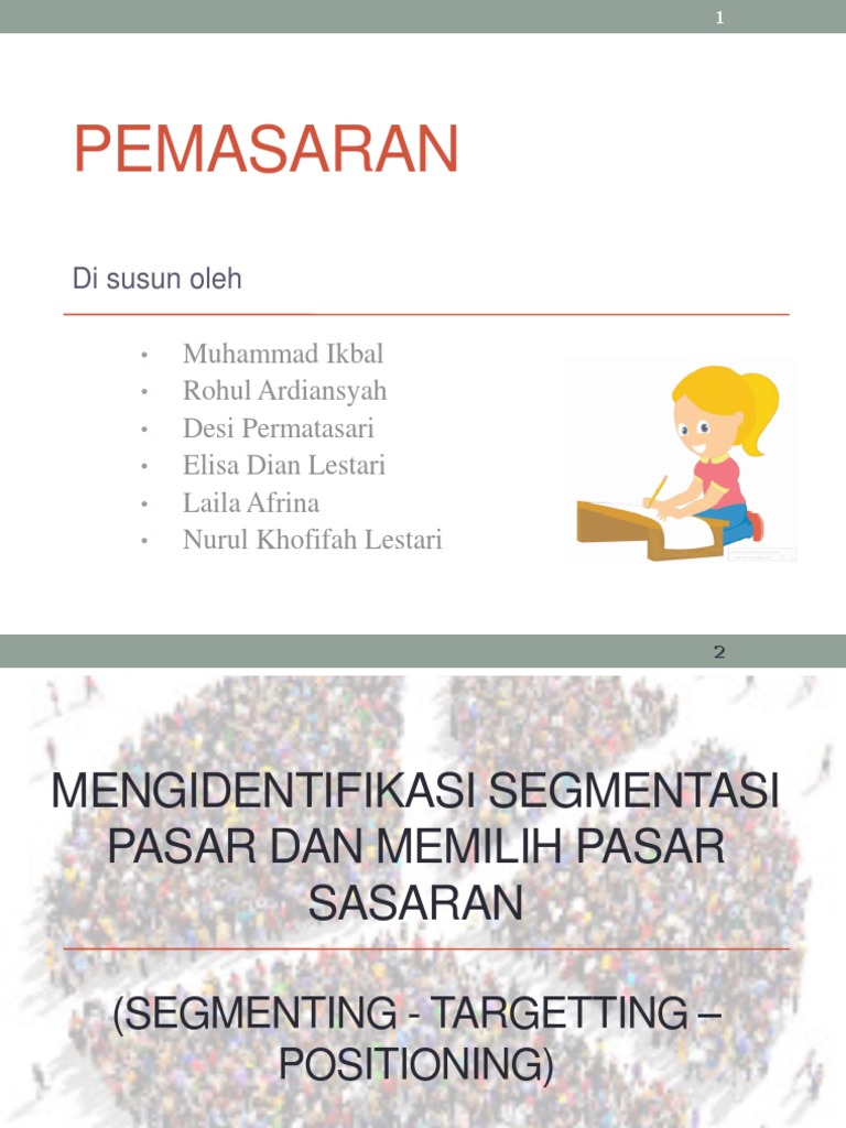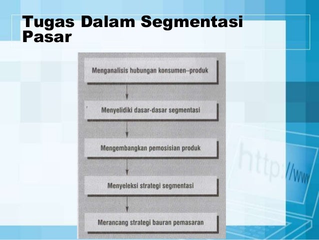 Segmentasi pasar segmentasi pasar adalah tindakan membagi pasar menjadi kelompok pembeli berbeda dengan kebutuhan, karakteristik, atau perilaku berbeda yang mungkin memerlukan produk atau bauran pemasaran terpisah 8 bab 7 strategi pemasaran yang digerakkan oleh pelanggan 2. Strategi pemasaran (marketing strategy) : Keragaman semacam itu membutuhkan strategi pemasaran dan bauran pemasaran yang berbeda. Memilih satu atau lebih segmen pasar untuk dimasuki (targeting pasar). Segmentasi (segmentation), targeting dan positioning. Segmentasi pasar adalah suatu proses menempatkan konsumen ke dalam subkelompok yang memiliki respons yang sama terhadap suatu program pemasaran (cravens,1997). Dalam strategi pemasaran, seorang pemasar (marketer) harus dapat melakukan tiga hal, yaitu segmentasi pasar (segmentation), membidik pasar (targeting), dan memposisikan produk pada pasar (positioning). Dengan melaksanakan segmentasi pasar, kegiatan pemasaran dapat dilakukan lebih terarah dan sumber daya yang dimiliki perusahaan dapat digunakan secara lebih efektif dan efisien dalam rangka memberikan kepuasan bagi konsumen. Segmentasi geografis merupakan strategi yang berguna bagi banyak pelaku pemasaran. Oleh karena itu, perusahaan mensegmentasi pasar dan menentukan segmen pasar yang ditargetkan. Segmentasi pasar juga dapat ditakrifkan sebagai proses pengidentifikasian dan menganalisa para pembeli di pasar produk, menganalisa perbezaan antara. Segmentasi pasar adalah adalah kegiatan pengklasifikasian konsumen dalam sebuah pasar berdasarkan perilaku, kebutuhan, dan karakteristiknya yang kemudian digunakan untuk menentukan produk atau bauran pemasaran yang berbeda antara segmen pasar satu dengan segmen pasar yang lainnya.untuk contoh, tujuan, manfaat, syarat, dan dasar segmentasi pasar, silahkan baca artikel ini selengkapnya. Segmentasi pemasaran lintas budaya atau global;